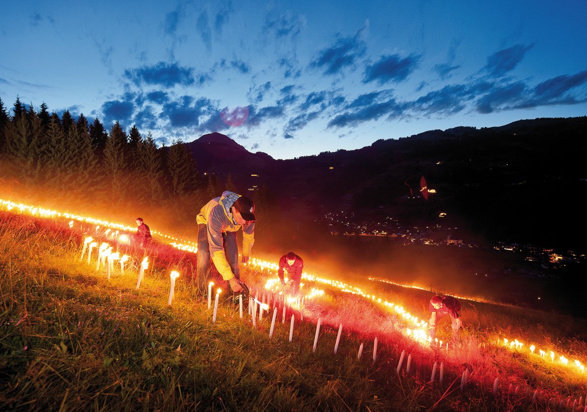 In Tirol hat das Entzünden der Bergfeuer zur Sonnenwende, wenn der längste Tag und die kürzeste Nacht aufeinander treffen, schon lange Tradition. Bei Einbruch der Dunkelheit sieht man an den markanten Felsformationen des Wilden Kaisers unzählige Feuerbilder und Lichterketten leuchten. Viele Motive haben symbolischen Charakter und sollen nach mittelalterlichem Brauch Geister und Dämonen vertreiben und den Sommer begrüßen. Man genießt dieses Naturschauspiel entweder vom Bergrestaurant auf dem Hartkaiser oder dem Brandstadl auf der gegenüberliegenden Talseite. Ein Erlebnis für alle Sinne!